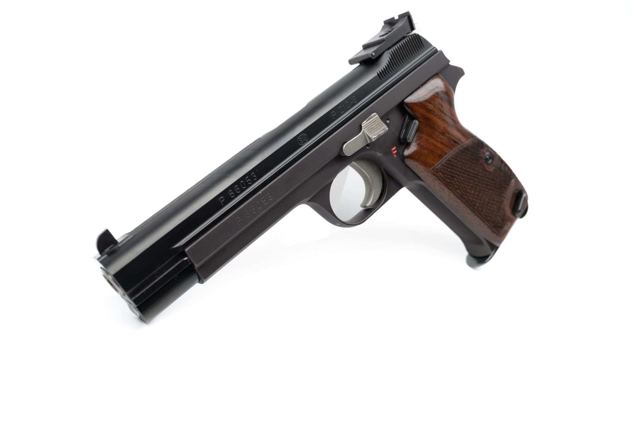 Charakteristisch für die P210-6 ist das innenliegende Schlittenführungssystem, das eine außergewöhnlich enge Toleranzführung ermöglicht. In Verbindung mit dem präzise gefertigten Lauf sorgt dies für ein konstant reproduzierbares Trefferbild. Der Single-Action-Abzug zeichnet sich durch einen klar definierten Druckpunkt und eine saubere Auslösung aus – ideal für präzisionsorientierte Disziplinen.